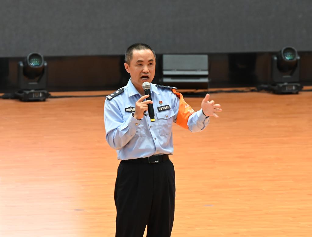 为提高同学们的安全防范意识,营造良好的校园安全环境,9月26日,文学院“文德课堂”在东区学生实训中心开展安全教育讲座,昆明市公安局交警支队五大队王磊警官、昆明市公安局呈贡分局吴家营派出所倪辉警官应邀分别作交通安全和反诈知识宣传的专题讲座。学院2024级本科生、研究生660余人参加了讲座。讲座由学院党委副书记赵兴元老师主持。