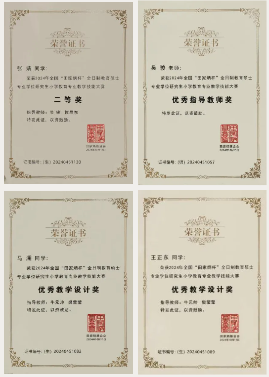 全国“田家炳杯”全日制教育硕士专业学位研究生教学技能大赛是目前层次最高、规模最大的教育硕士教学技能竞赛赛事,旨在提升教育硕士研究生教育教学实践能力,促进培养院校之间相互交流学习、共同发展。在本次大赛中,3位同学的优异表现充分展示了学院全日制教育硕士专业学位研究生小学教育专业学生的综合素质和创新能力,也充分表明了学校对硕士研究生综合实践教学能力的高度重视与指导成效。下一步,学院将围绕“151战略行动计划”,以“双教协同”发展战略为引领,进一步聚焦和强化师范生专业技能培养,不断提高师范生培养质量,提升服务基础教育高质量发展的能力,助力基础教育优质均衡发展。