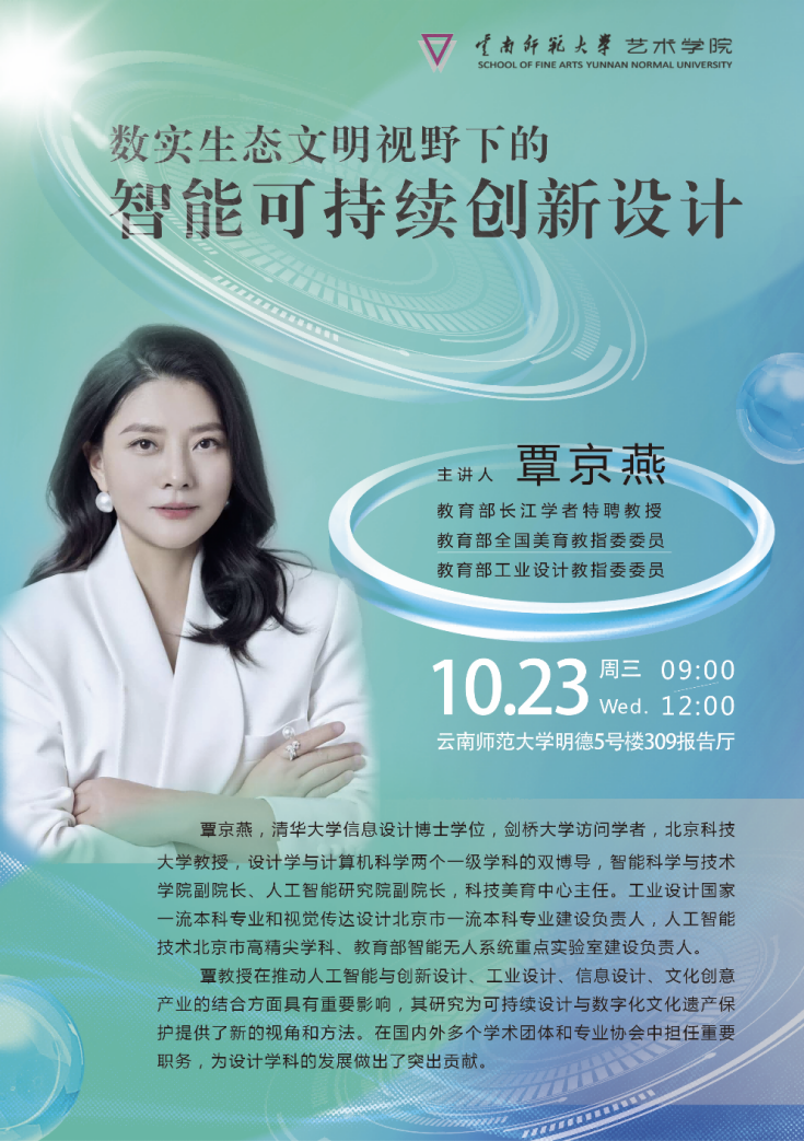10月23日,教育部长江学者特聘教授、教育部全国美育教指委委员、教育部工业设计教指委委员覃京燕教授,在艺术学院明德5号楼报告厅做题为“数实生态文明视野下的智能可持续创新设计”的精彩讲座。艺术学院及信息学院200余名师生参加了此次讲座,讲座由艺术学院院长刘连杰教授主持。