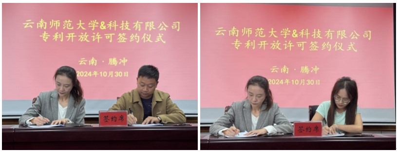 何苗表示,云南师范大学与腾冲市有着深厚的情谊,学校将积极推动科技成果落地腾冲,助力企业高质量发展。科研团队代表依次进行成果路演,路演展示的技术引起了与会企业兴趣,多家企业期望与我校建立长期合作,共同推进科研成果的转化应用。活动现场云南师范大学与腾冲经济技术开发区两家企业签订了专利开放许可协议。