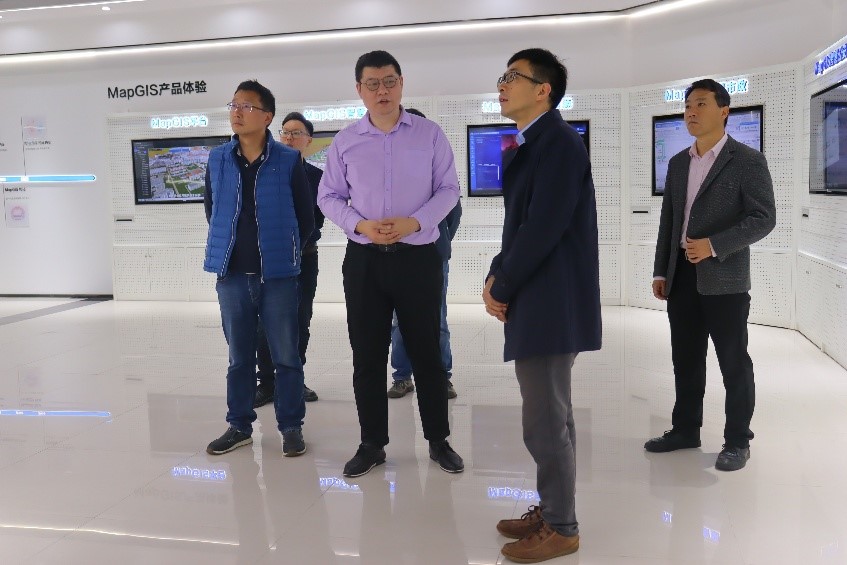 签约前,邢影陪同陈光杰一行参观了中地数码GIS展厅、武汉中地研发中心、新中地教育教学环境,了解了中地数码作为国产自主可控品牌从创立到崛起的发展历程,MapGIS的历次更新迭代、产品技术自主创新、人才培养等不同领域的突出成果。