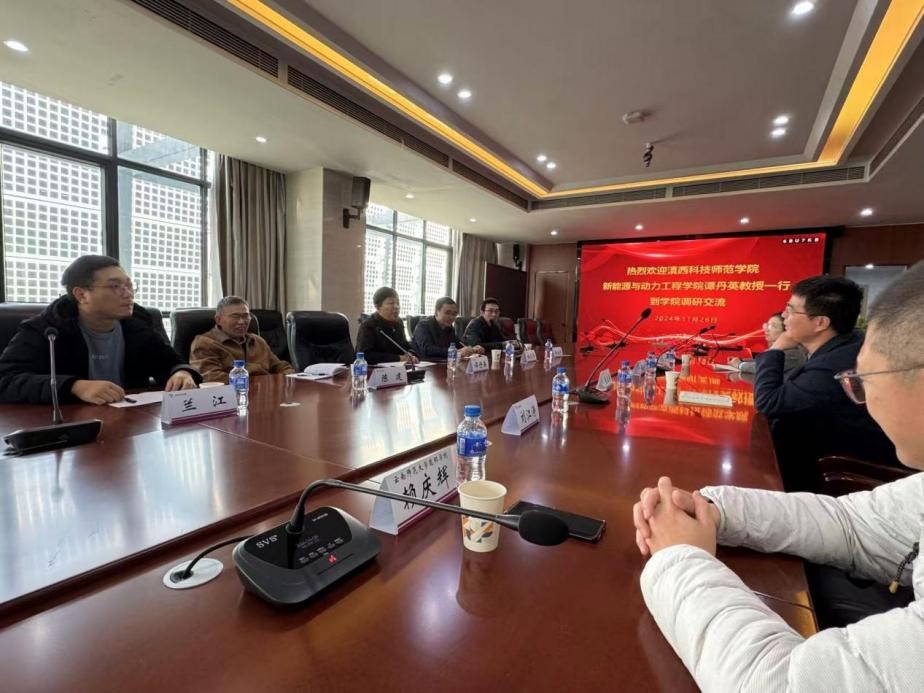 11月26日,滇西科技师范学院新能源与动力工程学院副院长(主持工作)谭丹英、杨丕华副教授、西南大学银龄教师陈建教授、能源与动力工程专业负责人傅永平教授、能源与动力工程专业兰江老师一行到我校能源与环境科学学院访问交流。我校能源与环境科学学院院长陈玉保、党委副书记蒋金和、副院长马逊以及相关教师参加座谈交流。