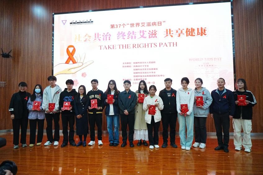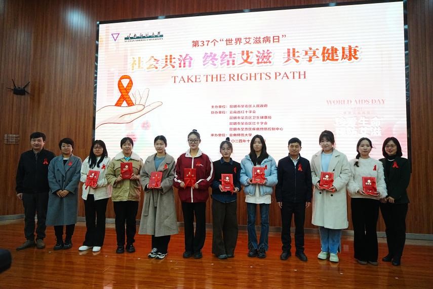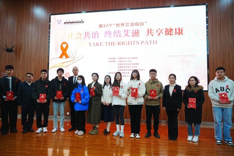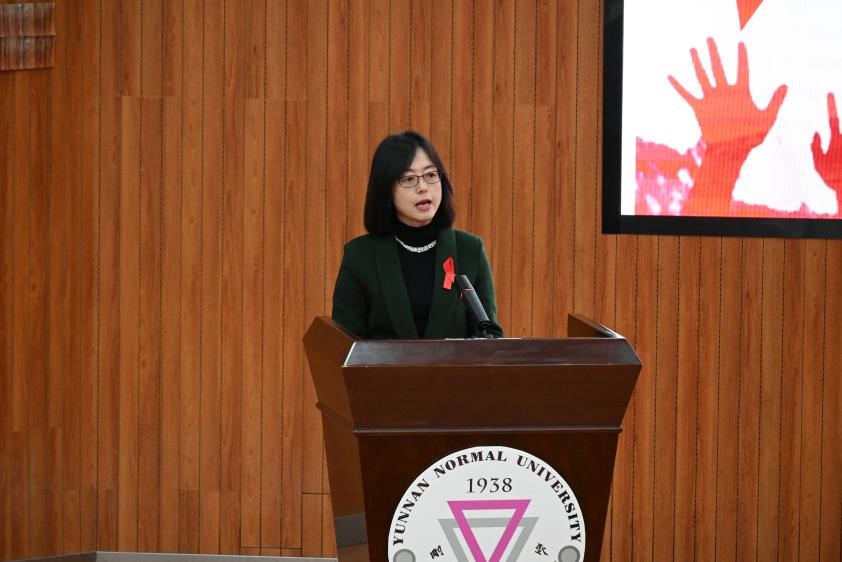 在第 37 个“世界艾滋病日”到来之际,12月1日下午,我校在呈贡校区举办第37个世界艾滋病日宣传教育活动。本次活动由昆明市呈贡区人民政府主办,云南师范大学承办,云南省红十字会、昆明市呈贡区卫生健康局、昆明市呈贡区红十字会、昆明市呈贡区疾病预防控制中心协办。昆明市呈贡区人民政府副区长王会飞,呈贡区防治艾滋病委员会成员单位主要负责人,我校团委书记郑伟俊、校医院院长广洁丽、学生处副处长詹镇宇以及各学院(学部)师生代表等430余人参加活动。