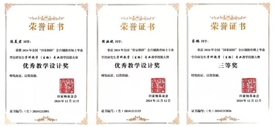 12月12日,2024年全国“田家炳杯”全日制教育硕士专业学位研究生学科教学(生物)专业教学技能大赛决赛在浙江师范大学举办。经过激烈角逐,生命科学学院蔡鹏同学获三等奖,侯丛斌、陈美君同学获优秀教学设计奖。