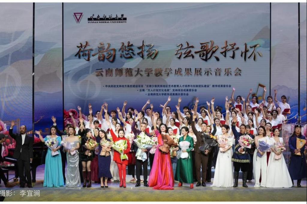 音乐会由何纾教授及其团队共同演绎,集中展示了我校师生秉承西南联大“刚毅坚卓”的校训,以培养师范类人才为主体,以创新教学内容为方式,助力培养云南省少数民族艺术人才,推动云南民族地区声乐育人成果的经典教学。
