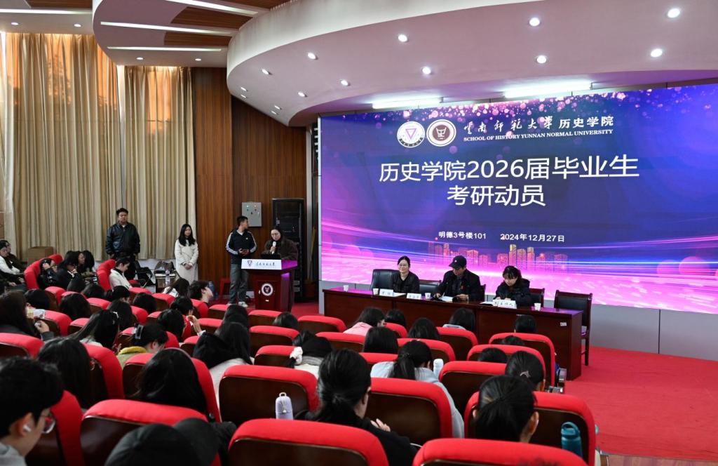 12月27日上午,历史学院2026届毕业生考研动员大会在明德3号楼101报告厅召开。学院院长黄海涛、党委副书记李琳、副院长丁琼参加会议,会议由辅导员杨保维主持。