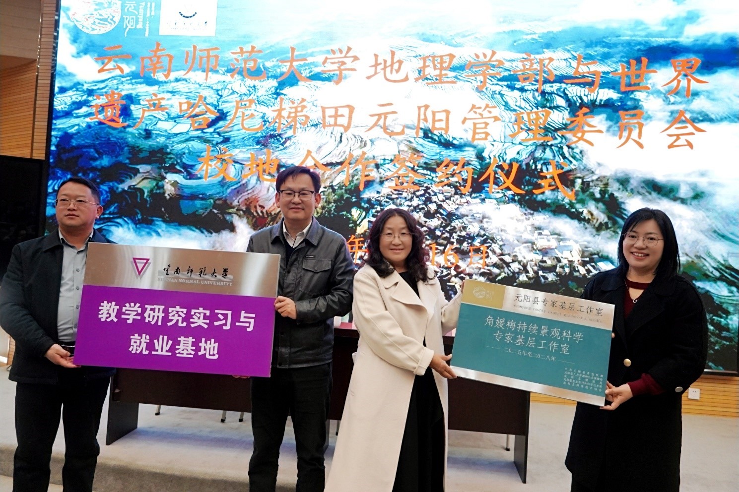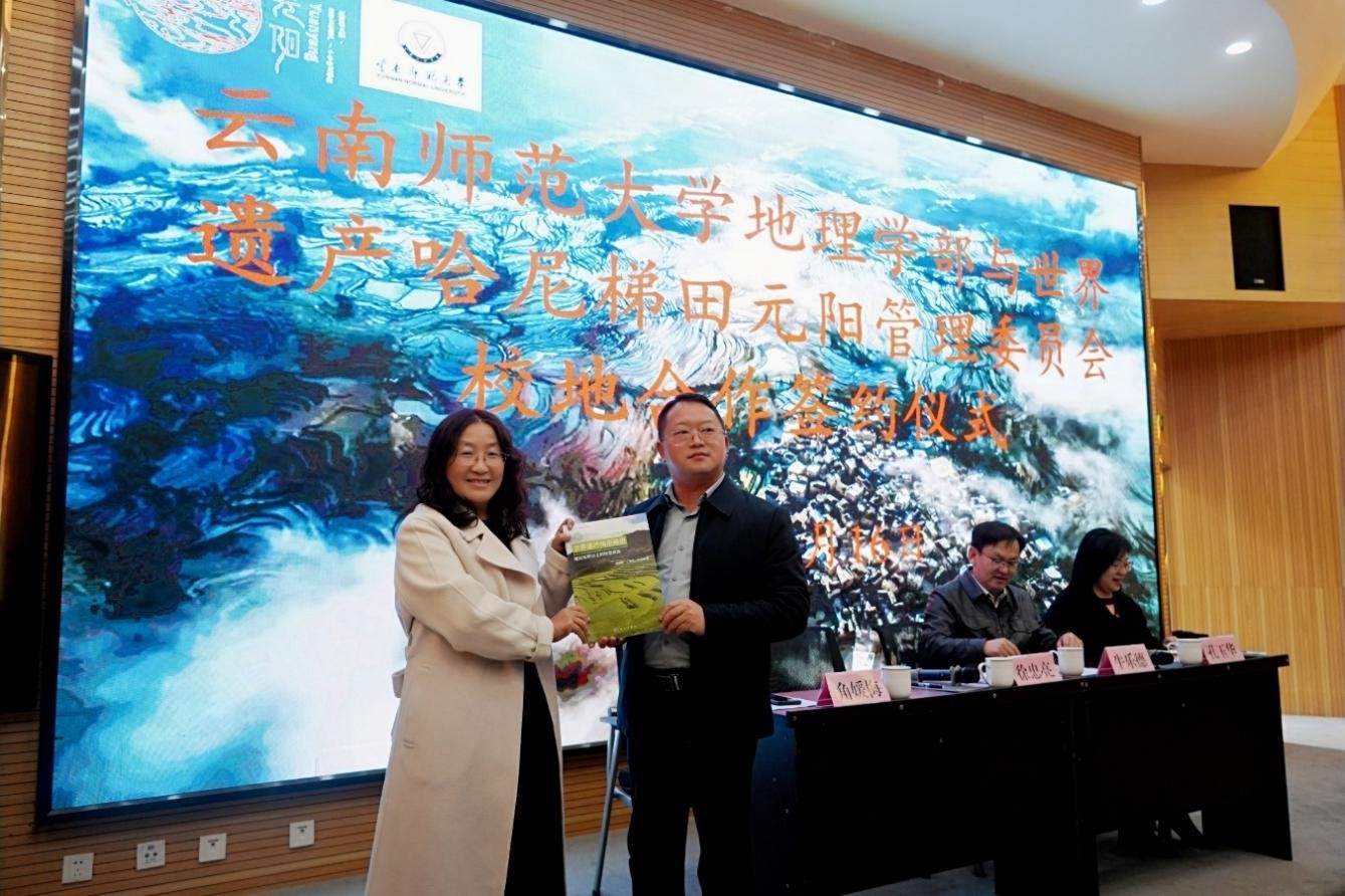 签约现场,地理学部与元阳县梯管委签订了“云南师范大学教学研究实习与实践基地”协议并授牌,宣布“角媛梅持续景观科学专家基层工作室”挂牌设立。同时,角媛梅向元阳县梯管委捐赠了科普读物《世界遗产哈尼梯田·雕刻在群山上的和谐家园》300册。
