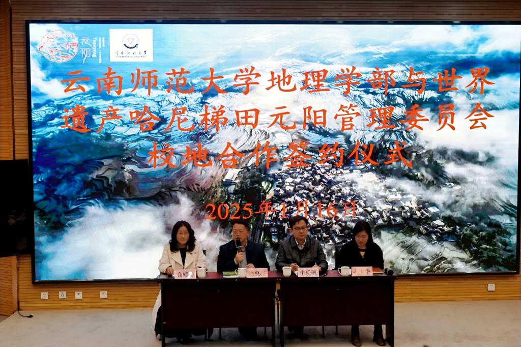 牛乐德表示,我校地理学部在地理科学研究与人才培养领域积累了深厚的学科底蕴和专业优势,此次合作是学部响应国家校地协同发展、促进产学研深度融合的重要举措,旨在通过实践教学与科研合作,培养兼具理论素养与实践能力的高层次人才,助力地理学科发展和社会服务能力提升。角媛梅分享了深耕哈尼梯田30年研究的见解和感悟,她将自己在文化景观遗产、景观生态学、水文水资源等方面的科研成果与地方需求深度融合,致力于为哈尼梯田文化景观遗产的保护与传承贡献力量。