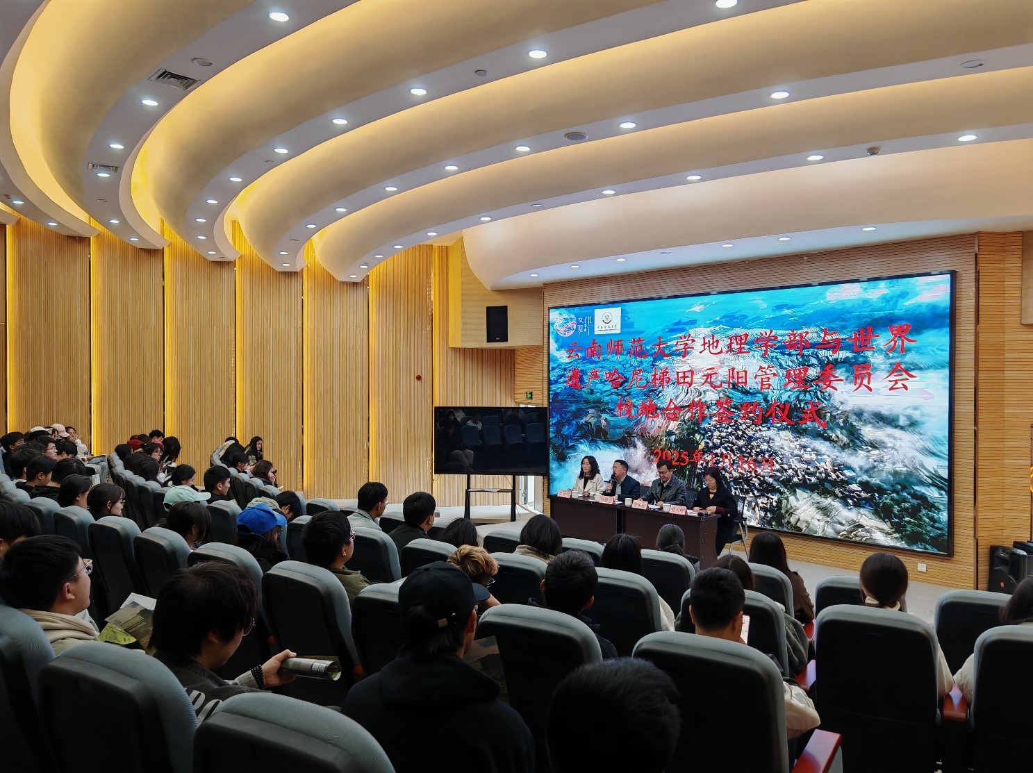 近日,我校地理学部与世界遗产哈尼梯田元阳管理委员会(简称梯管委)签订校地合作协议,全面启动各项工作。签约仪式在红河州元阳县哈尼梯田文化博物馆举行,地理学部副主任牛乐德,角媛梅教授,梯管委专职副主任徐忠亮,元阳县委组织部副部长孔玉华及新街镇相关部门负责人参加仪式。