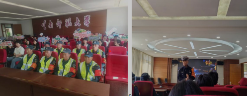为进一步增强师生交通安全意识,营造文明和谐的校园环境,3月27日下午,保卫处组织开展“交通安全进校园”专题活动。昆明市公安局交通警察支队五大队民警王磊、学校平安校园志愿服务大队、保安公司人员、学生代表参加了活动。活动包括室内讲座、室外培训两个阶段。