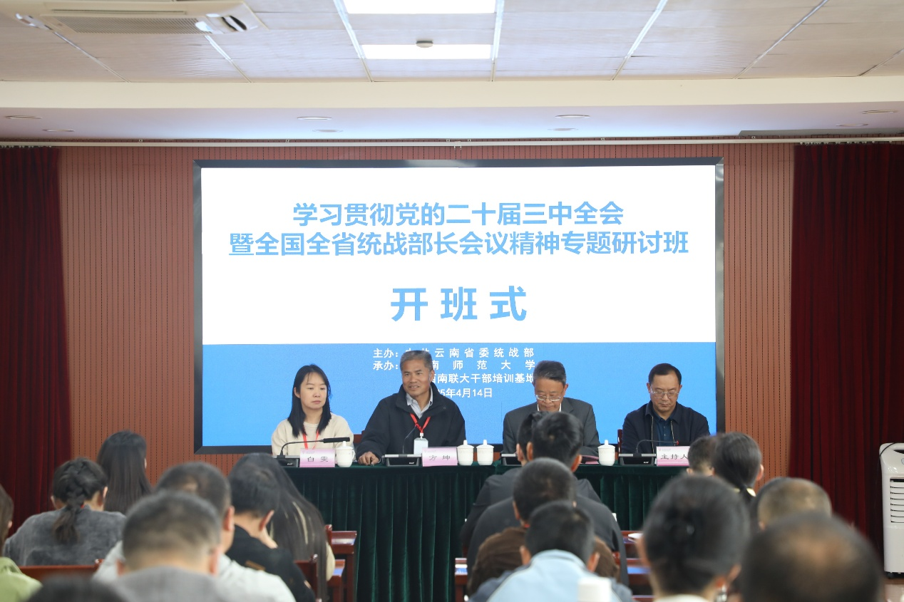 4月14日上午,由中共云南省委统战部主办,云南西南联大干部培训基地承办的“学习贯彻党的二十届三中全会暨全国全省统战部长会议精神专题研讨班”在我校一二·一校区开班。云南省黄埔军校同学会办公室一级调研员方坤,省委统战部干部处四级调研员白雯,我校党委常委、统战部部长吴雁江,全省统战系统干部50人参加培训。
