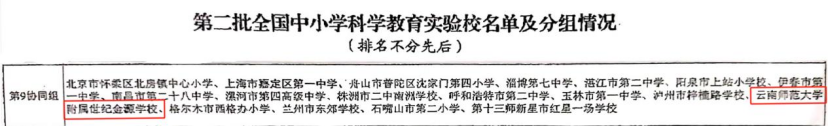 近日,教育部办公厅发布《关于确定第二批全国中小学科学教育实验区、实验校的通知》(教监管厅函〔2025〕3号)的通知,经自主申报、省级推荐、专家组复核等程序,云南师范大学附属世纪金源学校被认定为全国中小学科学教育实验校。