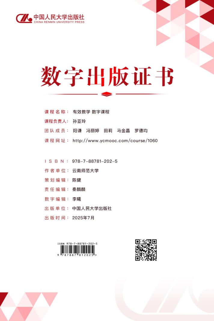 近日,由教育学部孙亚玲教授领衔,阳谦副教授、冯丽婷副教授、田莉教授、马金晶副教授、罗德均老师共同建设的《有效教学》数字课程在中国人民大学出版社正式上线出版。
