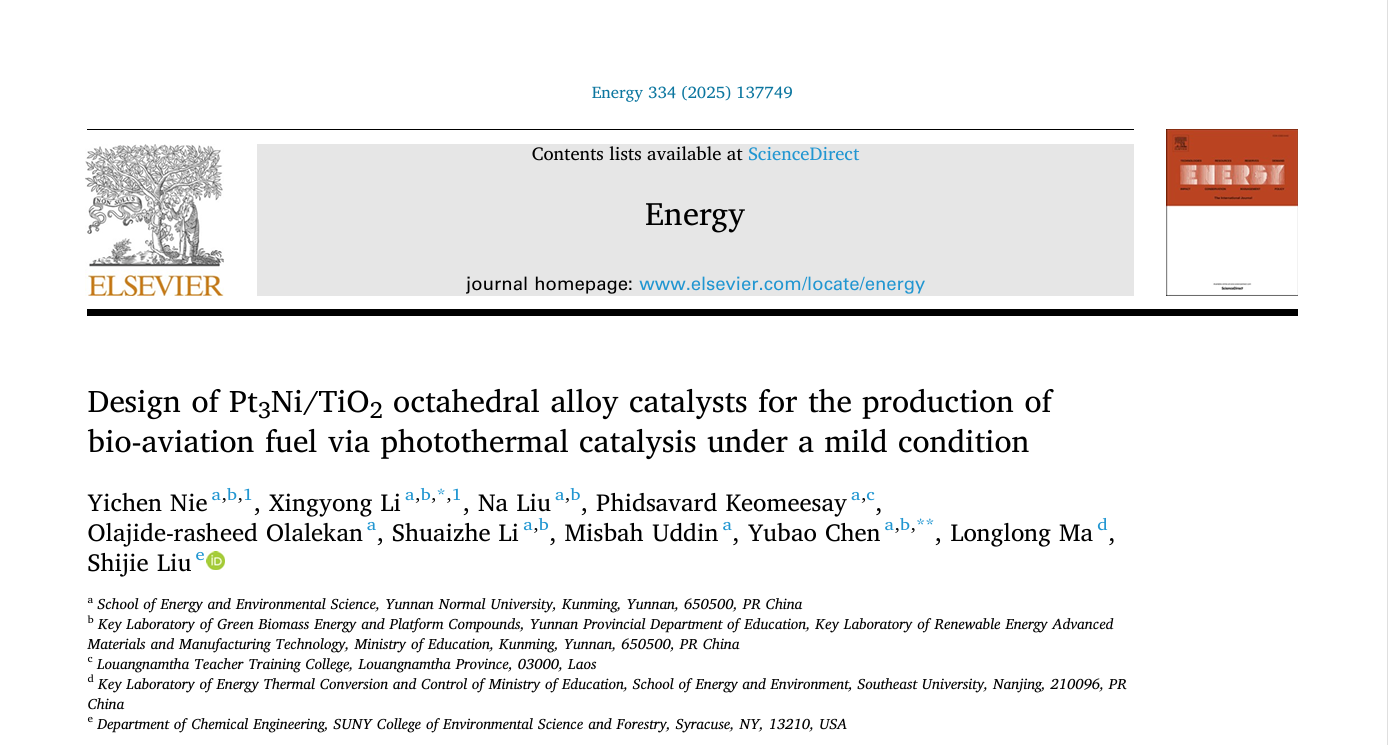 近日,国际期刊《Energy》在线刊发我校能源与环境科学学院生物质高效炼制与环境工程团队在生物航空煤油制备领域的最新研究成果:《Design of Pt3Ni/TiO2 octahedral alloy catalysts for the production of bio-aviation fuel via photothermal catalysis under a mild condition》(中国科学院一区TOP,影响因子IF = 9.4)。论文链接:https://doi.org/10.1016/j.energy.2025.137749,硕士研究生聂懿宸为论文的第一作者,青年教师李兴勇、院长陈玉保教授为论文共同通讯作者。论文得到了东南大学马隆龙研究员、纽约州立大学Shijie Liu教授的指导。