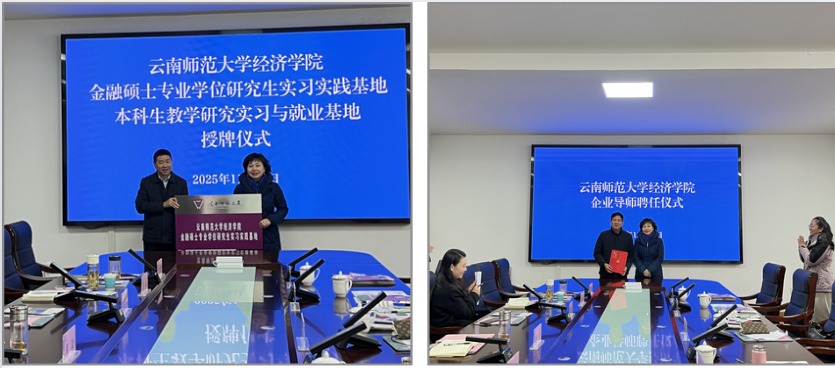 双方代表签署《战略合作协议》,并进行“云南师范大学经济学院金融硕士专业学位研究生实习实践基地”和“云南师范大学经济学院本科生教学研究实习与就业基地”授牌。杨栋会向祖凌颁发了“企业导师”聘书。