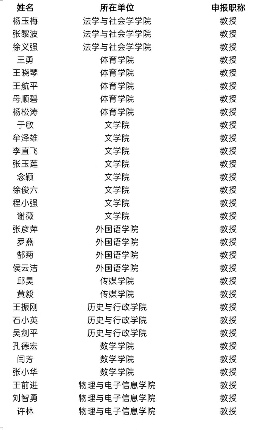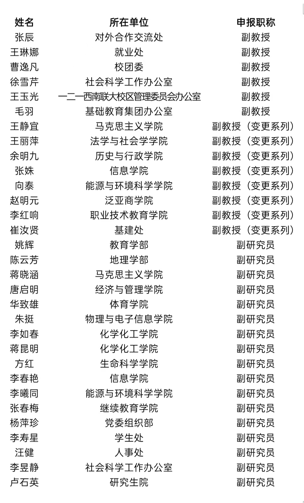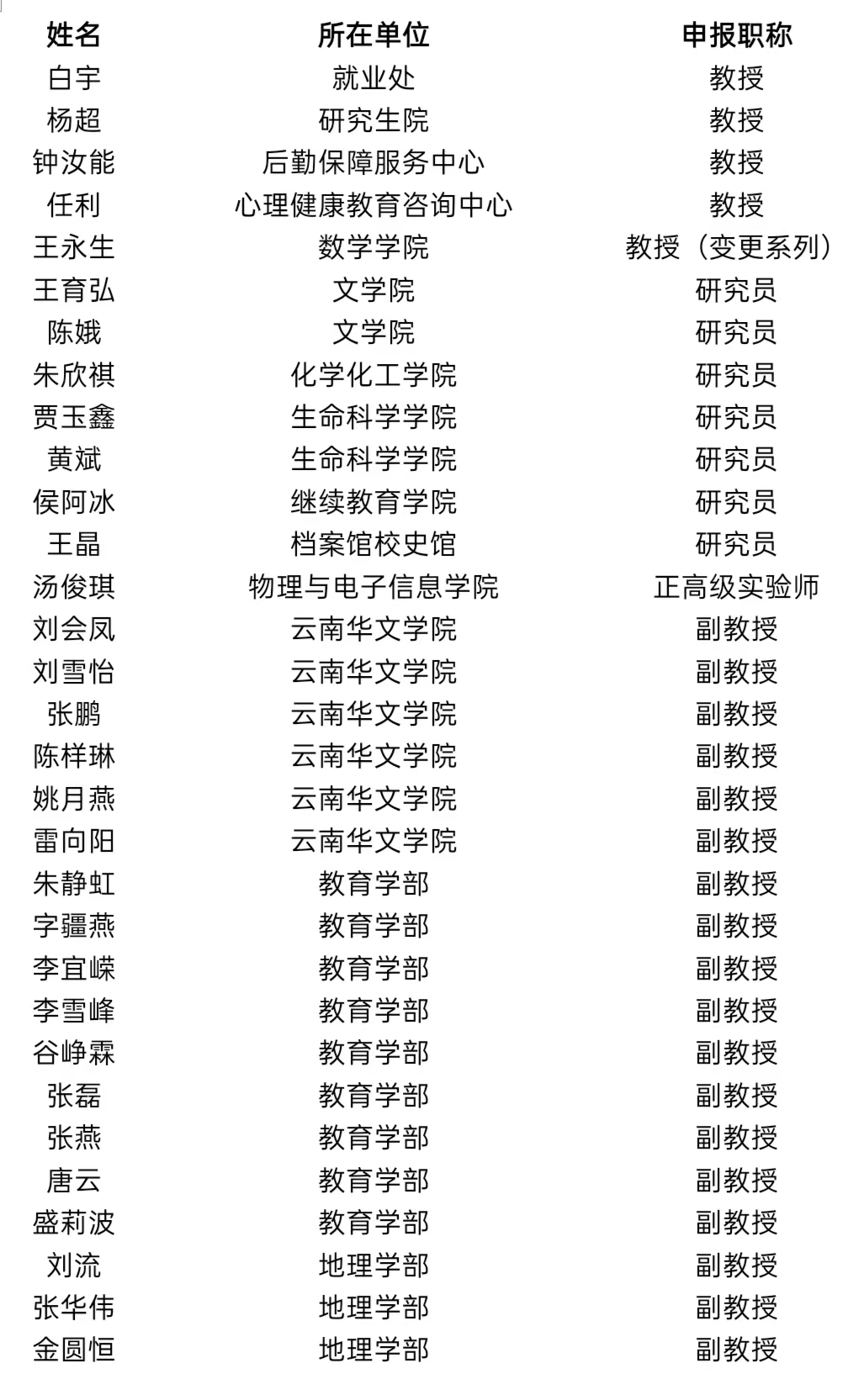 经资格审查,拟同意以下申报评审高级职称人员提交云南师范大学教授副教授评审委员会评审,现进行公示(同部门按姓氏笔画排序)。