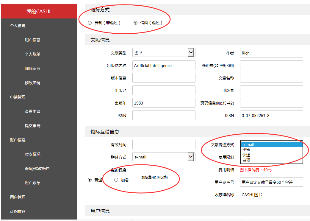 6、在服务方式中,如果要借阅原件,就选默认的“借阅(返还)”,如果只需要复印件,就选“复制(非返还)”。在文献传递方式中,如果是电子的就选默认的e-mail,如果是纸质的,就选择“快递”。如果读者急需某文献资源,还可以在加急程度中选择“加急”。最后点击下方的“提交”按钮。