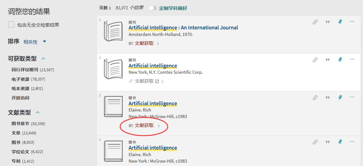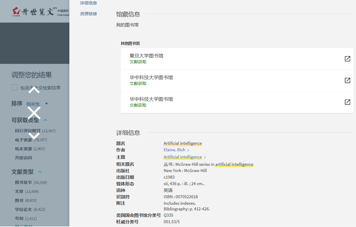 4、在文献资源列表中,点击“文献获取”按钮,进入文献获取页面。小提示:在文献获取页面可以查看文献的详细信息,以确定是否要借阅文献。之后选择某个大学图书馆,再点击“文献获取”按钮,进入CASHL文献传递服务页面。