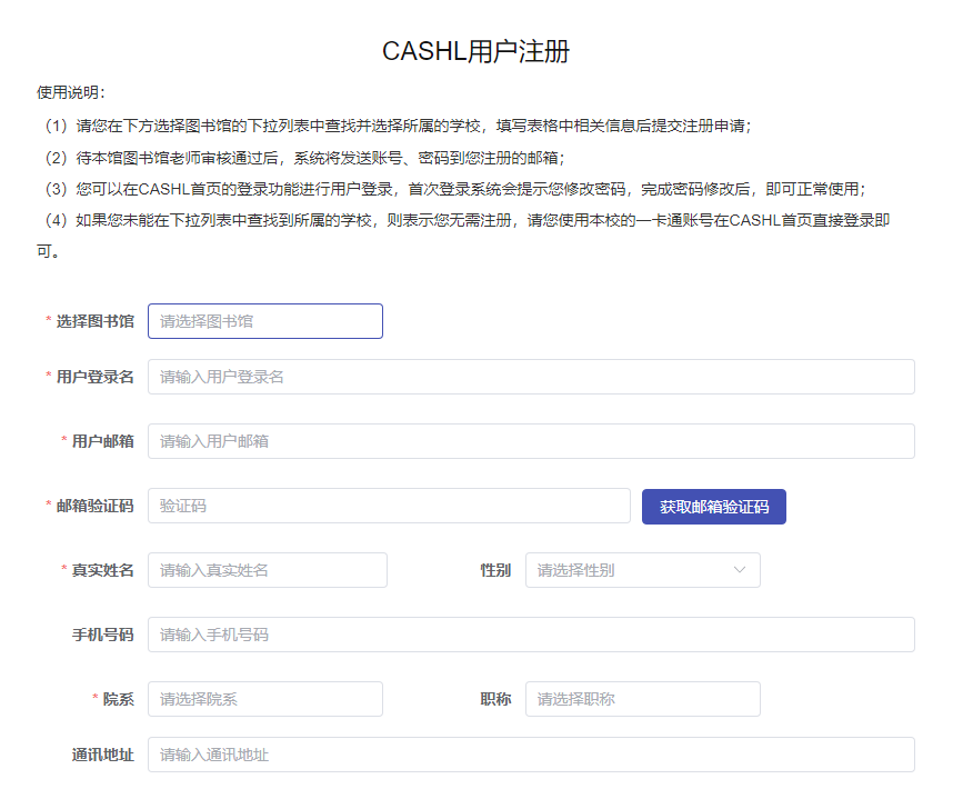 2、填好用户信息后,点击“提交注册申请”按钮,注册完成,之后等待图书馆员审核,审核通过后,审核通过后用户会收到一封含有账号密码的邮件,请及时登录CASHL更改密码。