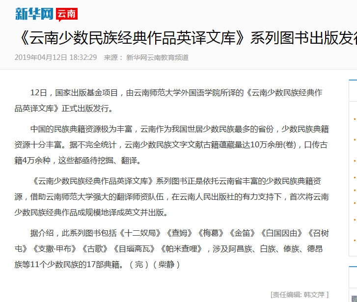 上一条:云南日报 2019-4-14 《云南少数民族经典作品英译文库》 系列图书出版 下一条:云视晚间新闻 2019-03-16 我省举行2019年公费师范毕业生暨师范类高校毕业生双选洽谈会