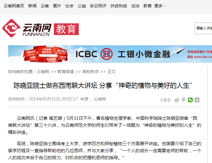 云南网 2019-05-31 陈晓亚院士做客西南联大讲坛 分享“神奇的植物与美好的人生”