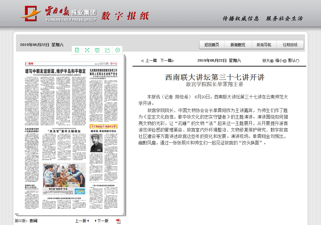 上一条:都市时报 2019-06-21 故宫打算明年开放“延禧宫” 下一条:云南网 2019-06-20 “网红院长”单霁翔做客西南联大讲坛 听故宫“看门人”讲宫里事儿