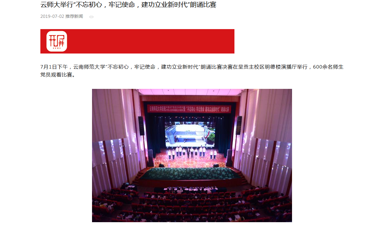 上一条:云南日报 2019-07-02 云师大举办“不忘初心、牢记使命,建功立业新时代”朗诵比赛 下一条:云南网 2019-07-01 云师大举行“不忘初心、牢记使命 建功立业新时代”朗诵比赛