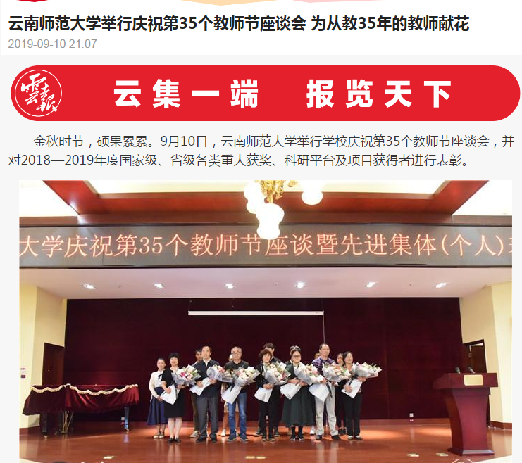 云南日报 2019-09-10 云南师范大学举行庆祝第35个教师节座谈会 为从教35年的教师献花
