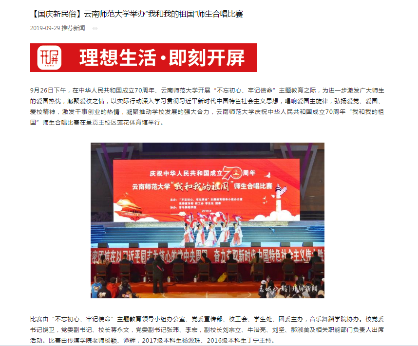 上一条:春城晚报 2019-09-30 社会各界西南联大旧址开展革命烈士纪念活动 下一条:云南网 2019-09-29 云南师范大学举办“我和我的祖国”师生合唱比赛