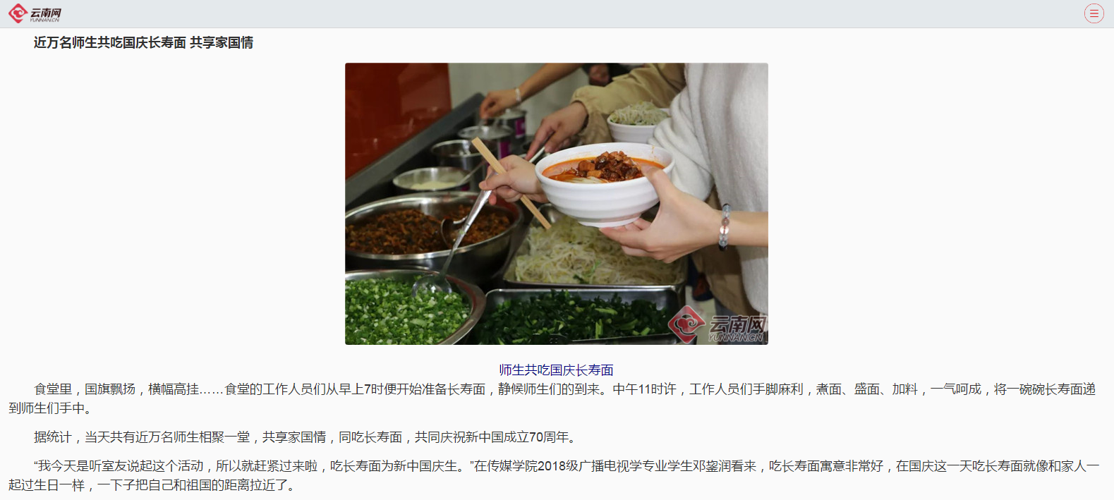 上一条:新华网 2019-10-02 近万名师生共享家国情同吃国庆面 下一条:云南新闻联播 2019-10-02 伟大成就催人奋进 接续奋斗再创辉煌 习近平总书记在庆祝中华人民共和国成立70周年大会上的重要讲话引发热烈反响