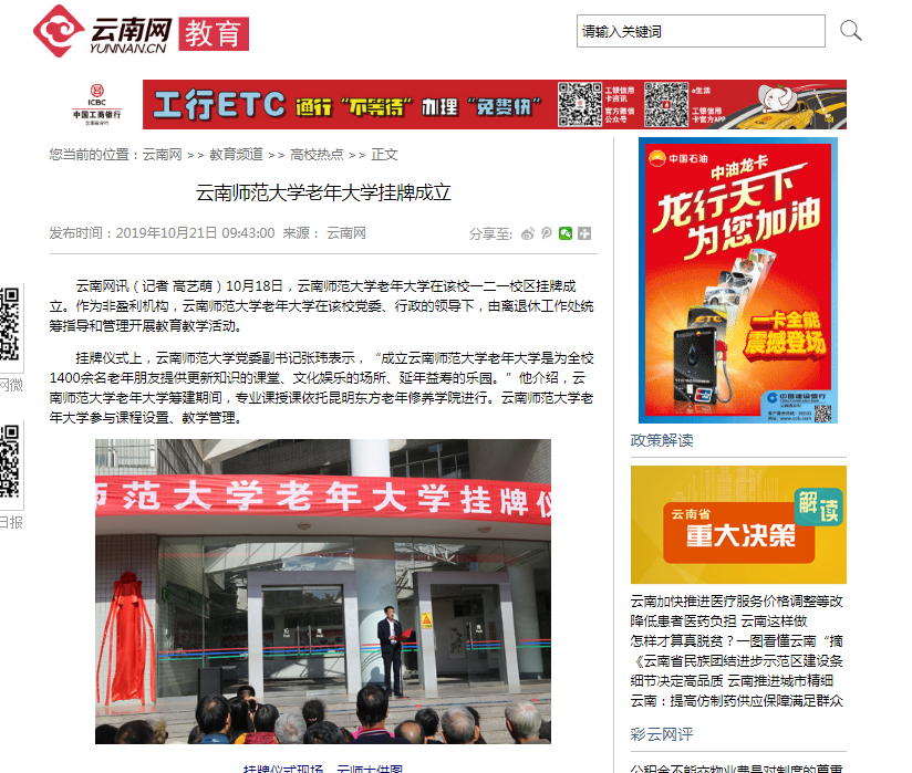 上一条:云南日报 2019-10-21 云师大老年大学挂牌 下一条:新华网 2019-10-19 云南师范大学老年大学挂牌成立