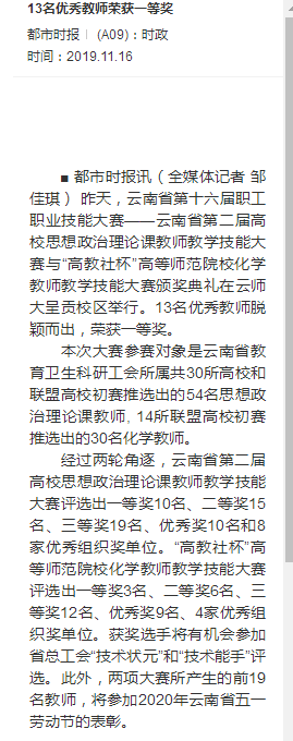 上一条:中国日报 2019-11-13 云南师范大学多举措扎实推进主题教育 下一条:云南日报 2019-11-15 云南省第二届高校思想政治理论课教师、化学教师教学技能大赛落幕