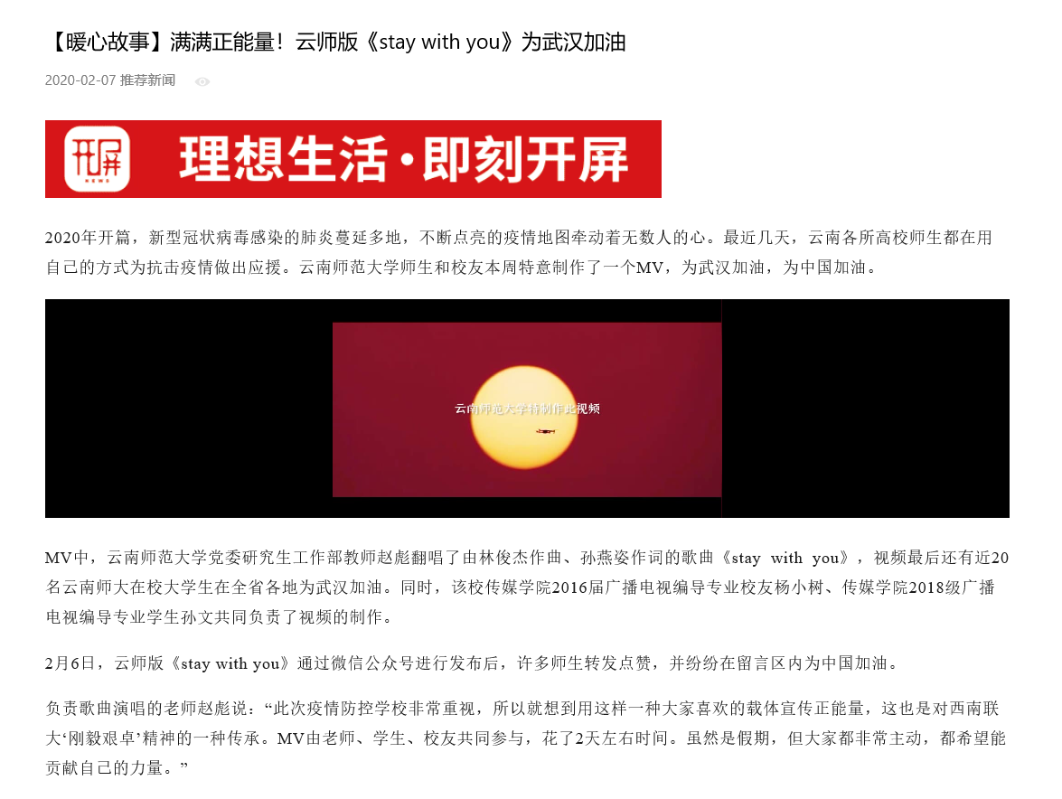 上一条:新华网 2020-02-13 致敬云南高校的“逆行者”们 下一条:云视新闻 2020-02-06 “声”援武汉|云师stay with you