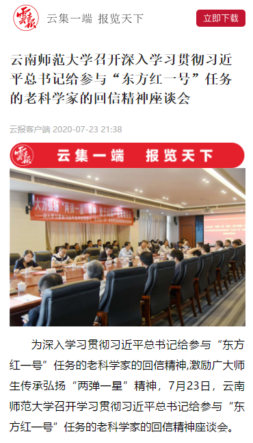 上一条:云南网 2020-07-25 云南师范大学举行深入学习贯彻习近平总书记给参与“东方红一号”任务的老科学家的回信精神座谈会 下一条:云南新闻联播 2020-07-23 传承弘扬老科学家精神