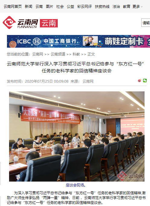 云南网 2020-07-25 云南师范大学举行深入学习贯彻习近平总书记给参与“东方红一号”任务的老科学家的回信精神座谈会