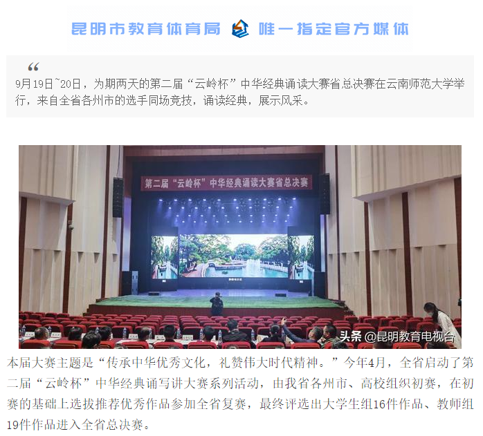 上一条:今日头条 2020-09-23 第二届“云岭杯”中华经典诵读大赛省总决赛落幕,诵经典展风采 下一条:昆明教育电视台 2020-09-23 第二届“云岭杯”中华经典诵读大赛省总决赛落幕 诵经典展风采
