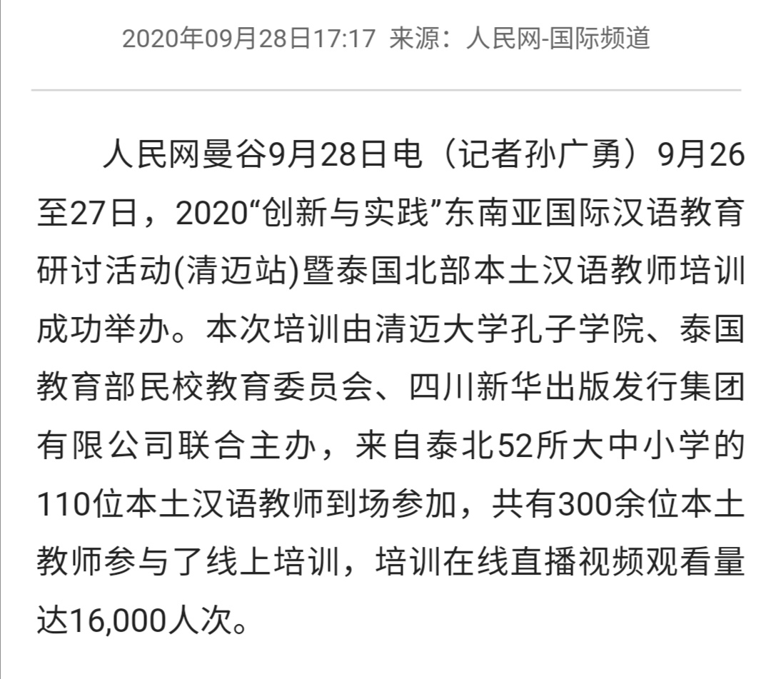 人民网 2020-09-29 2020“创新与实践”东南亚国际汉语教育研讨活动(清迈站)暨泰国北部本土汉语教师培训成功举办