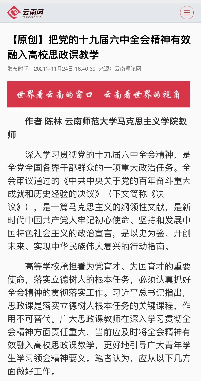 云南网 2021-11-24 【原创】把党的十九届六中全会精神有效融入高校思政课教学