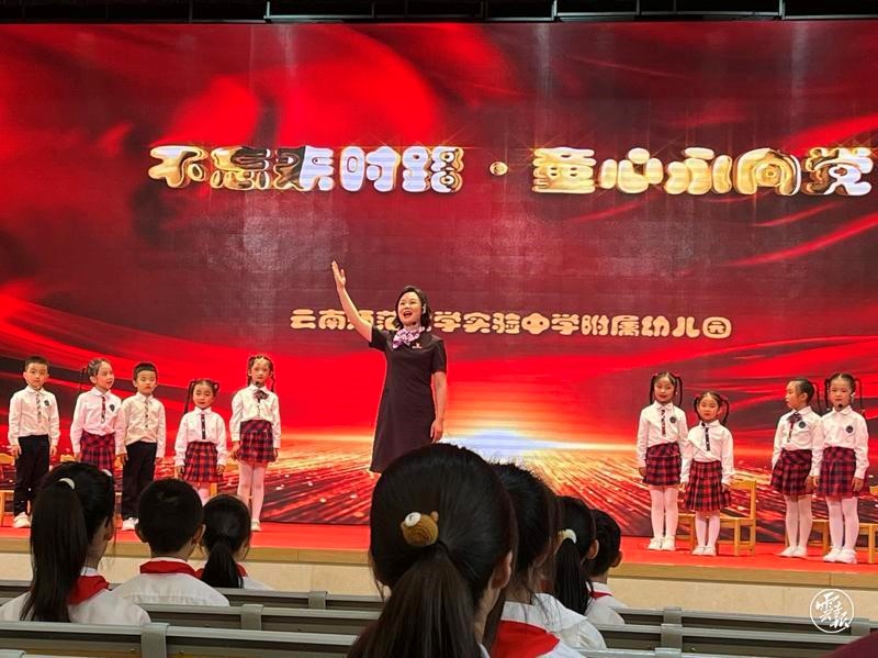 此次教学展示活动在云南师范大学职教学院学生合唱团带来的一曲悠扬婉转、催人奋进的《西南联大校歌》合唱中拉开帷幕。聚焦“爱国”这一主题,大中小幼学段的老师同学们同上一堂课、共悟爱国情。教学与实践展示“两位一体”,分别由云南师范大学实验中学附属幼儿园师生们带来的《不忘初心路 童心永向党》、云南师范大学实验中学小学部师生带来的《赓续红色血脉 传承联大精神》、云南师范大学实验中学初中部师生带来的《传联大之薪火 立报国之壮志》、云南师范大学实验中学高中部师生带来的《厚植联大情怀 不忘报国初心》、云南师范大学马克思主义学院师生带来的《大学生为什么要爱国》共计5场精彩展示活动构成,期间云南师范大学联大博物馆讲解员王齐、王馨2位讲解员生动讲述了《闻一多舍身取义》、《我愿以身许国》的联大动人故事,将展示活动推向了高潮。他们紧扣“爱国”这一主题,从情感体验、到理性认知、再到价值的引领,循序渐进、螺旋上升,为与会者生动讲述了爱国之情、之理、之力,引导学生们筑牢深厚的爱国情怀、坚定远大的理想信念、培注为中国特色社会主义持续奋斗的源源动力。