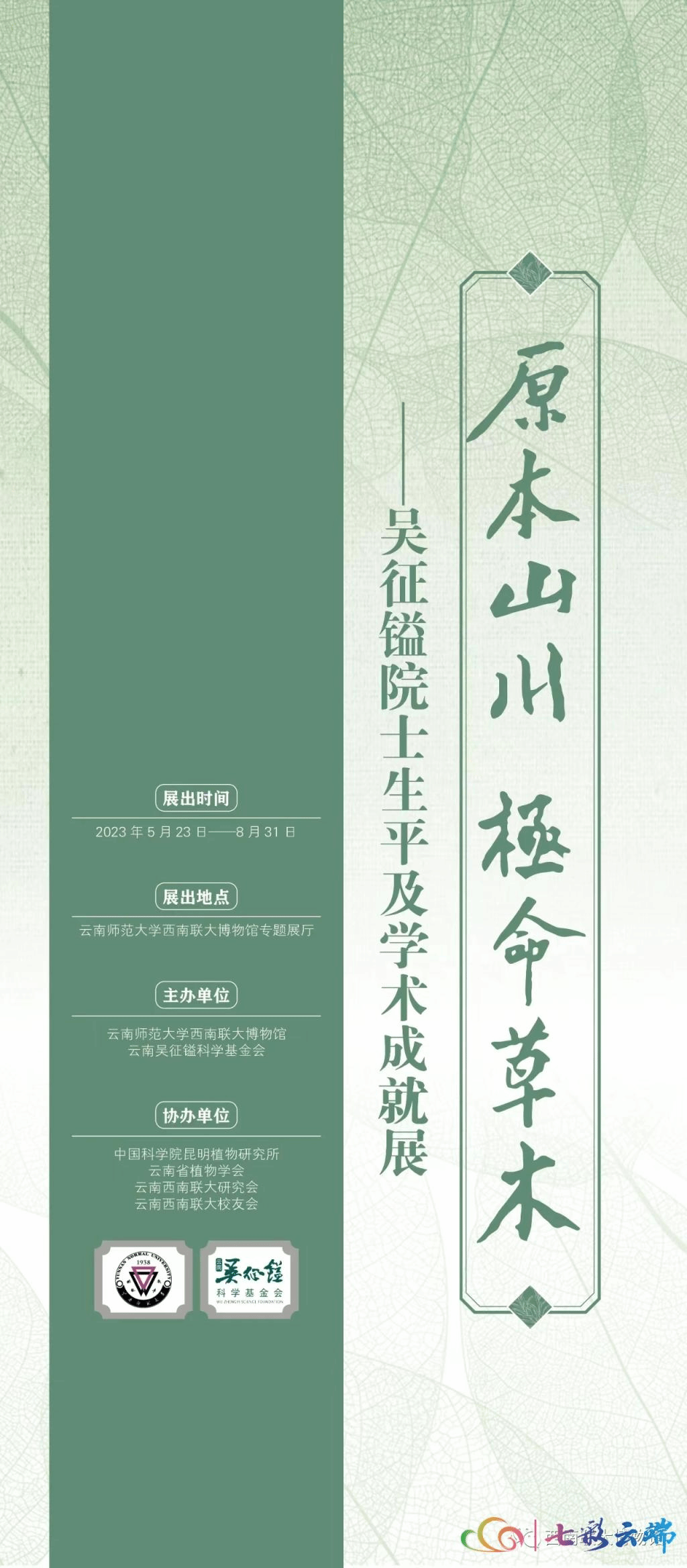 为回溯吴征镒先生的生平及学术成就,展现吴征镒先生追求真理、热爱科学、勇于探索的宝贵品质和精神财富,缅怀老一辈科学家爱党、爱国,为国家、民族做出的重大贡献,弘扬科学家精神,传承读书报国、扎根边疆、献身科学的爱国志向,由云南师范大学西南联大博物馆、云南吴征镒科学基金会主办的《原本山川 极命草木——吴征镒院士生平及学术成就展》从今天起面向公众免费开放,展期持续至8月底。