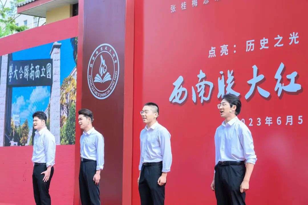 “缅维八年支持之苦辛,与夫三校合作之协和,可纪念者盖有四焉.......联合竟,使命彻。神京复,还燕碣。以此石,象坚节。纪嘉庆,告来哲。”4名传媒学院学生站在舞台中央,慷慨激昂地朗诵西南联大纪念碑碑文选段。