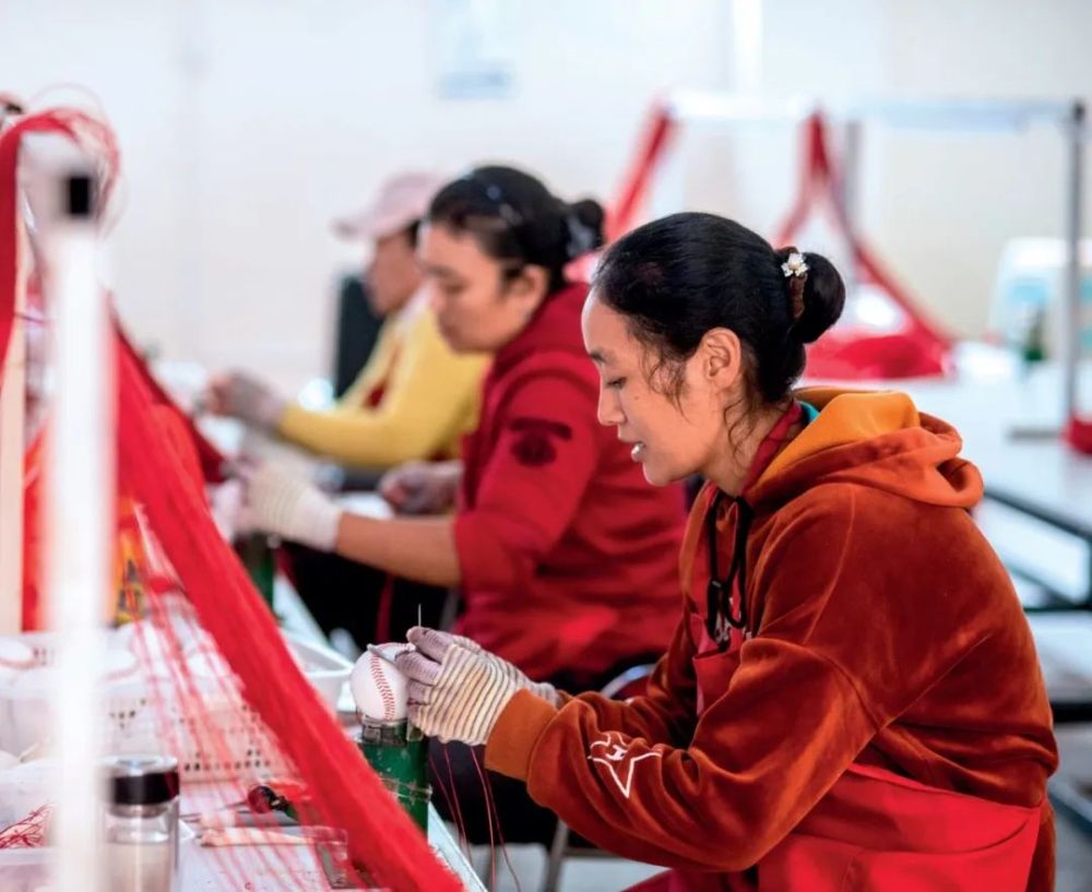 在云南省怒江傈僳族自治州福贡县匹河乡托坪村搬迁安置点,搬迁群众在扶贫车间缝制棒球(2020年11月2日摄) 胡超摄 / 本刊