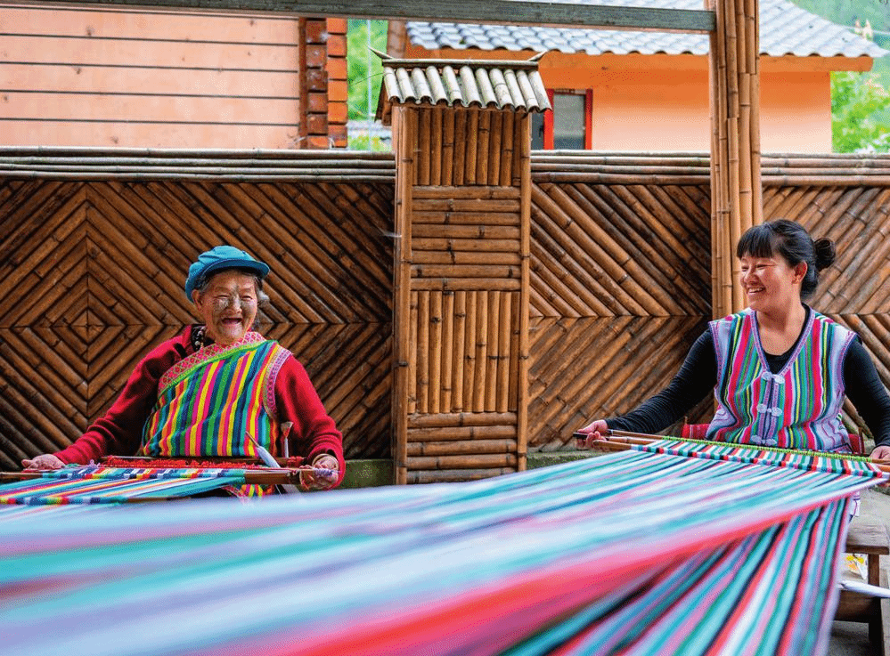 在云南省贡山独龙族怒族自治县独龙江乡迪政当村,独龙族老人李文仕(左)和女儿在编织独龙毯(资料照片) 曹梦瑶摄 / 本刊