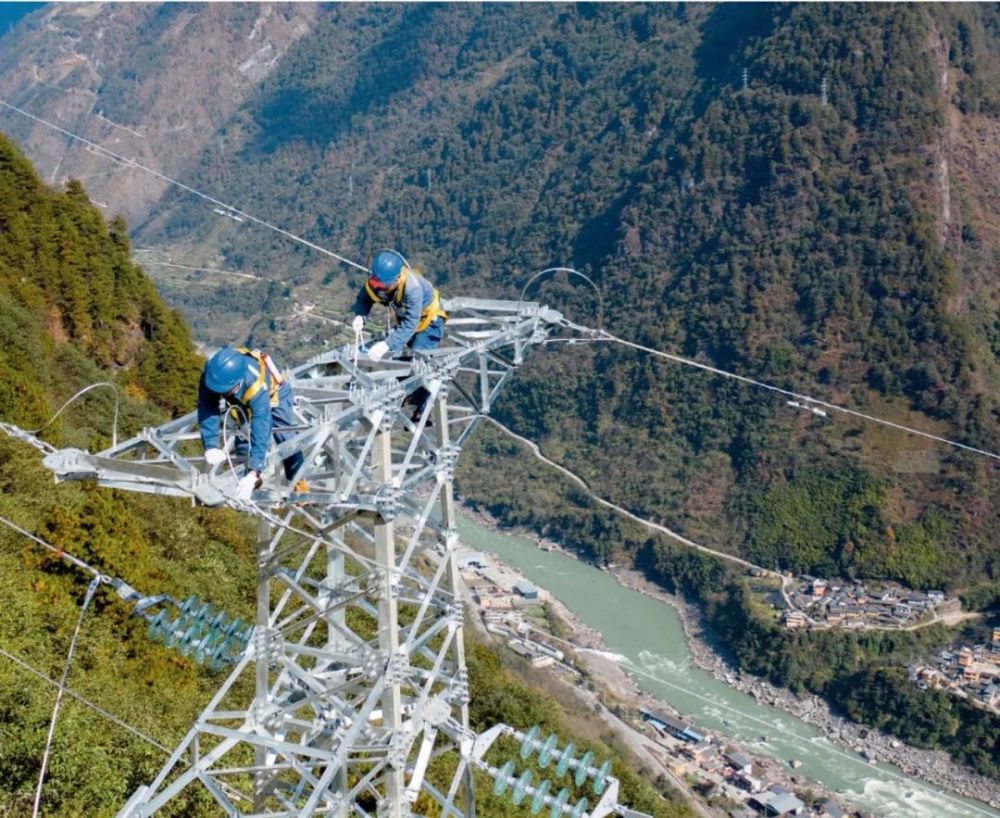 南方电网的高空作业人员在云南省怒江傈僳族自治州贡山县独龙江乡进行35千伏联网工程输电线路地线搭接工作(2020年12月29日摄) 南方电网供图