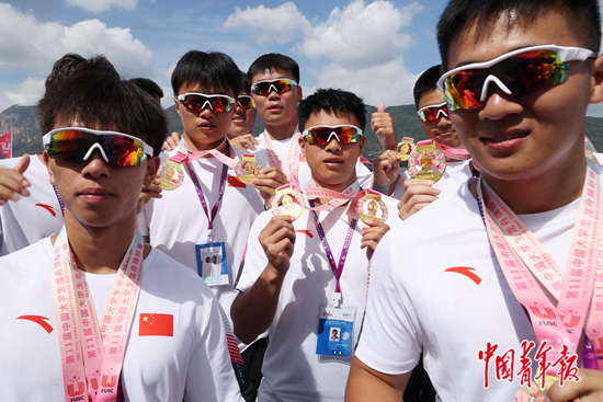 团队的氛围感、存在感、集体感、凝聚力,是大学生龙舟队员们最看重的。图为常州工程职业技术学院龙舟队员展示获奖奖牌。中青报·中青网记者 张文凌/摄