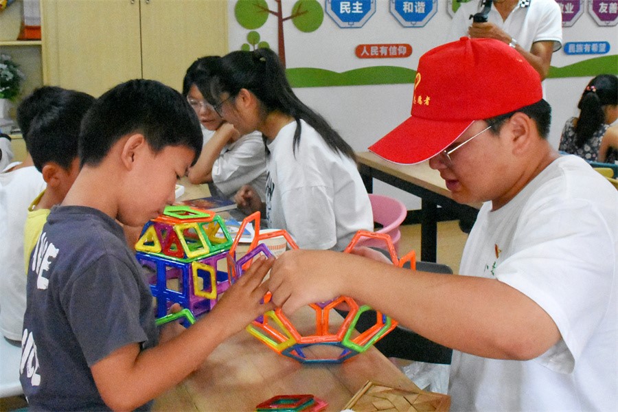 志愿者带领小朋友们在游戏的过程中感受数学的奇妙与乐趣(7月19日摄)云南师范大学 供图