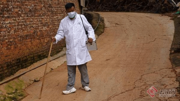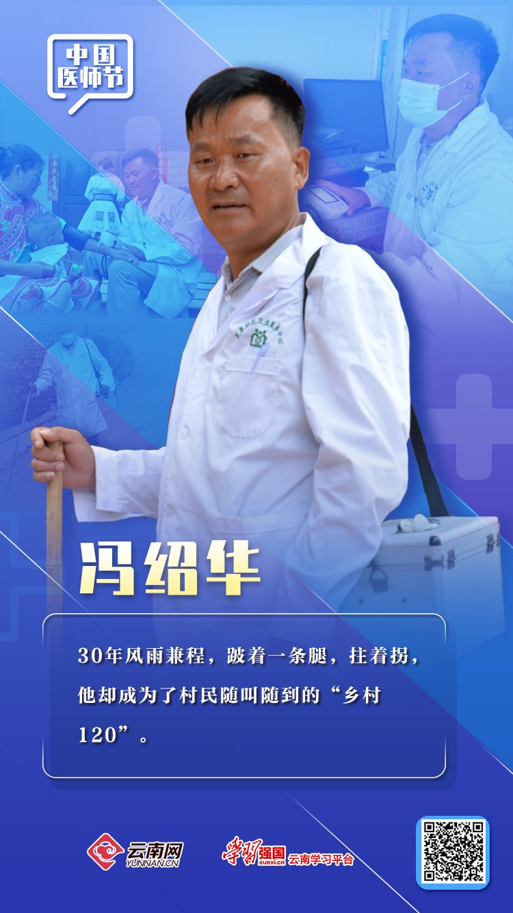 开远市乡村医生冯绍华从小右下肢残疾,走路跛行。30余年来,他依靠一根拐杖、一个药箱、一件白大褂、一支手电筒,行走在坑洼不平的泥泞小道、田间地头、走村串寨给群众送医送药送健康。30余年来,他手持问诊“老三样”(听诊器、血压计、体温表),依靠一张嘴、两条腿走村串寨地上门服务。村民谁患过什么病,谁对哪些药物过敏,他如数家珍。