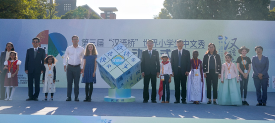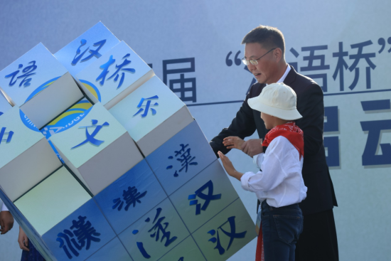 在活字魔方启动环节,领导们与小学生代表依次将活字魔方上凸起的“汉”“语”“桥”“快”“乐”“中”“文”七个汉字模块推入卡槽,呈现出此次活动的主题“汉语桥——快乐中文”。
