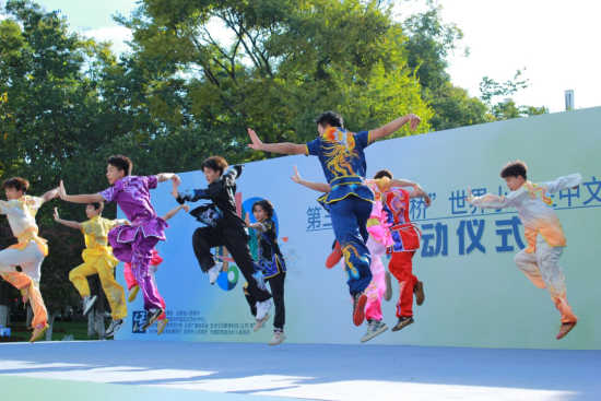 气势磅礴、刚柔并济的中华武术表演融合了舞拳、舞剑等元素,既有仙鹤柔美之姿,又有蛟龙阳刚之气。武术表演后,王德强为来自捷克赛区的选手代表授营旗。