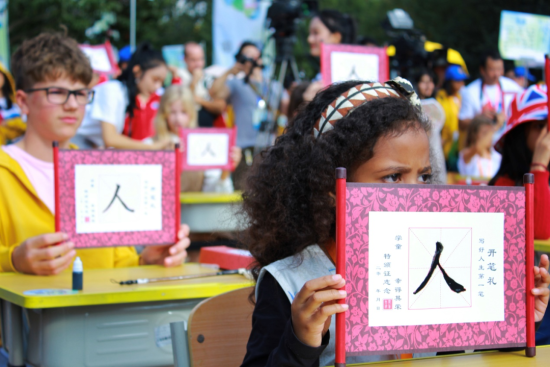 开笔启智,礼润童心。伴随着悠悠古乐,各国选手参加了“开笔启智”的中国传统入学礼——“开笔礼”。这是中国传统文化中对少儿开始识字学礼的一种启蒙教育形式,被称为人生“四大礼”的“第一礼”。58名小学生选手跟着台上示范者整理衣冠,行见面礼。随后,他们手持毛笔,一撇一捺,在描红纸上庄重地写下一个顶天立地的“人”字。领导们以及冠军观摩团在选手们的额头点上朱砂,意味开蒙启智,祝愿他们今后耳聪目明,奋发学习,坚持不懈追逐中文梦想。通过“自正衣冠”“见面行礼”“开笔向学”“朱砂启智”等庄重的环节,选手们感受到了中国传统文化的魅力,形象感知了中华礼仪之邦的内涵。
